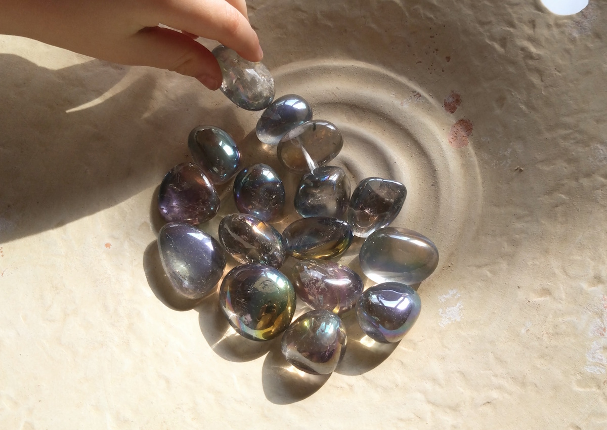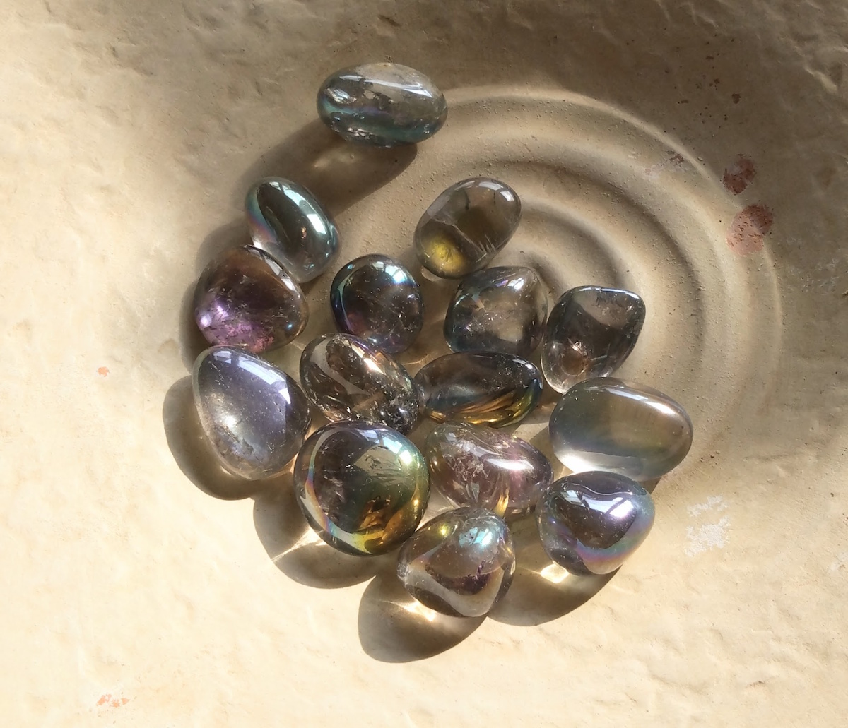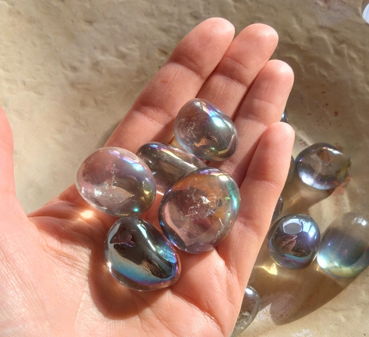 Reinige den Stein nur vorsichtig mit lauwarmem Wasser. Vermeide Seifen, aggressive Reinigungsmittel, Parfüm, Haarspray oder andere Chemikalien, da diese die empfindliche Beschichtung beschädigen oder ablösen können. Am besten bewahrst du den Stein separat auf, beispielsweise in einem weichen Stoffbeutel, um Kratzer durch andere Steine zu vermeiden.