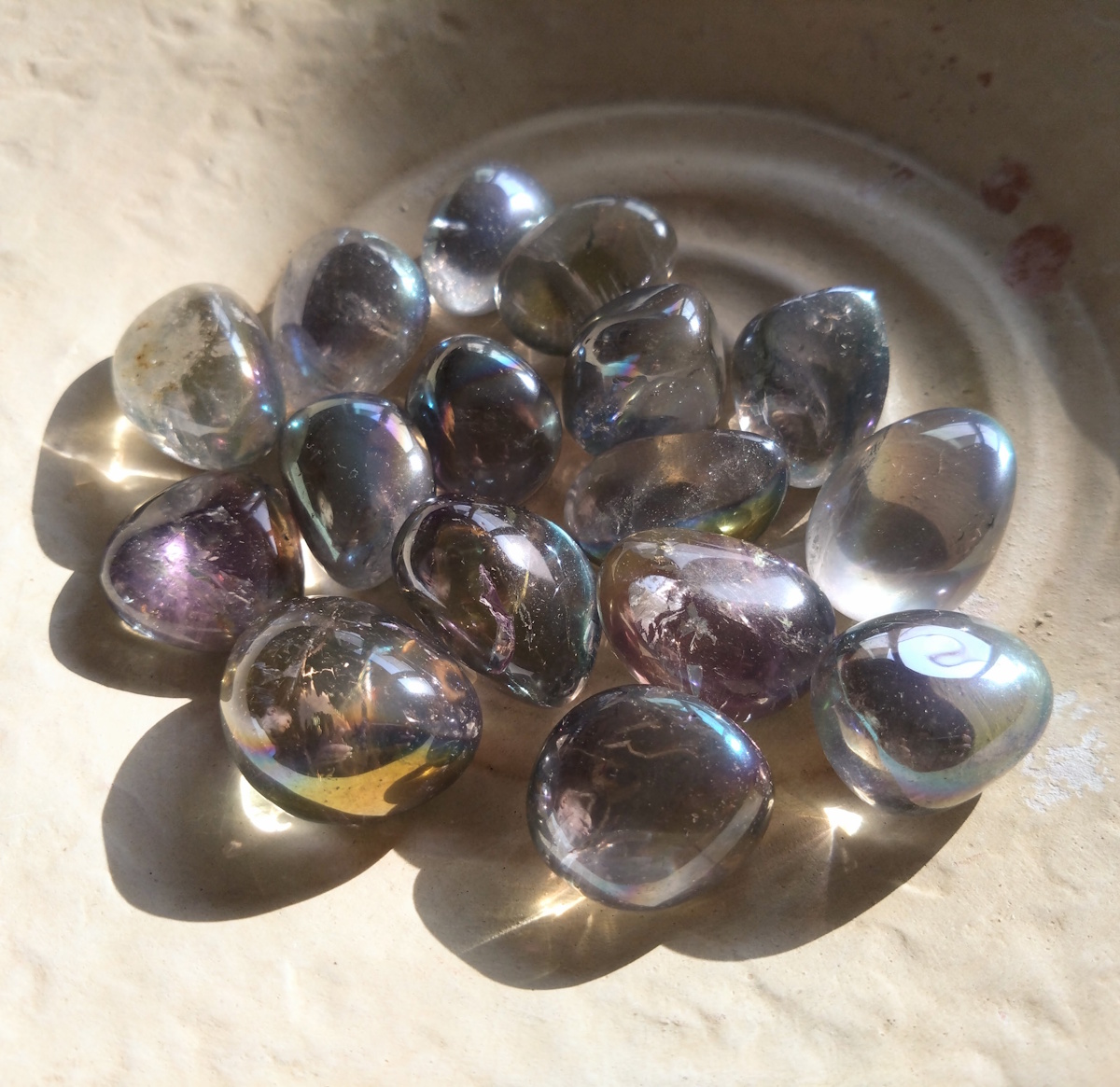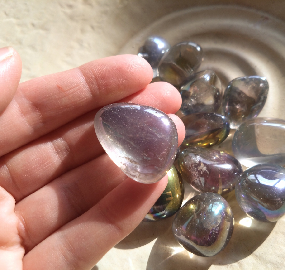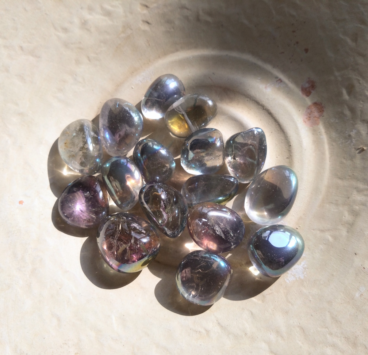 Reinige den Stein nur vorsichtig mit lauwarmem Wasser. Vermeide Seifen, aggressive Reinigungsmittel, Parfüm, Haarspray oder andere Chemikalien, da diese die empfindliche Beschichtung beschädigen oder ablösen können. Am besten bewahrst du den Stein separat auf, beispielsweise in einem weichen Stoffbeutel, um Kratzer durch andere Steine zu vermeiden.