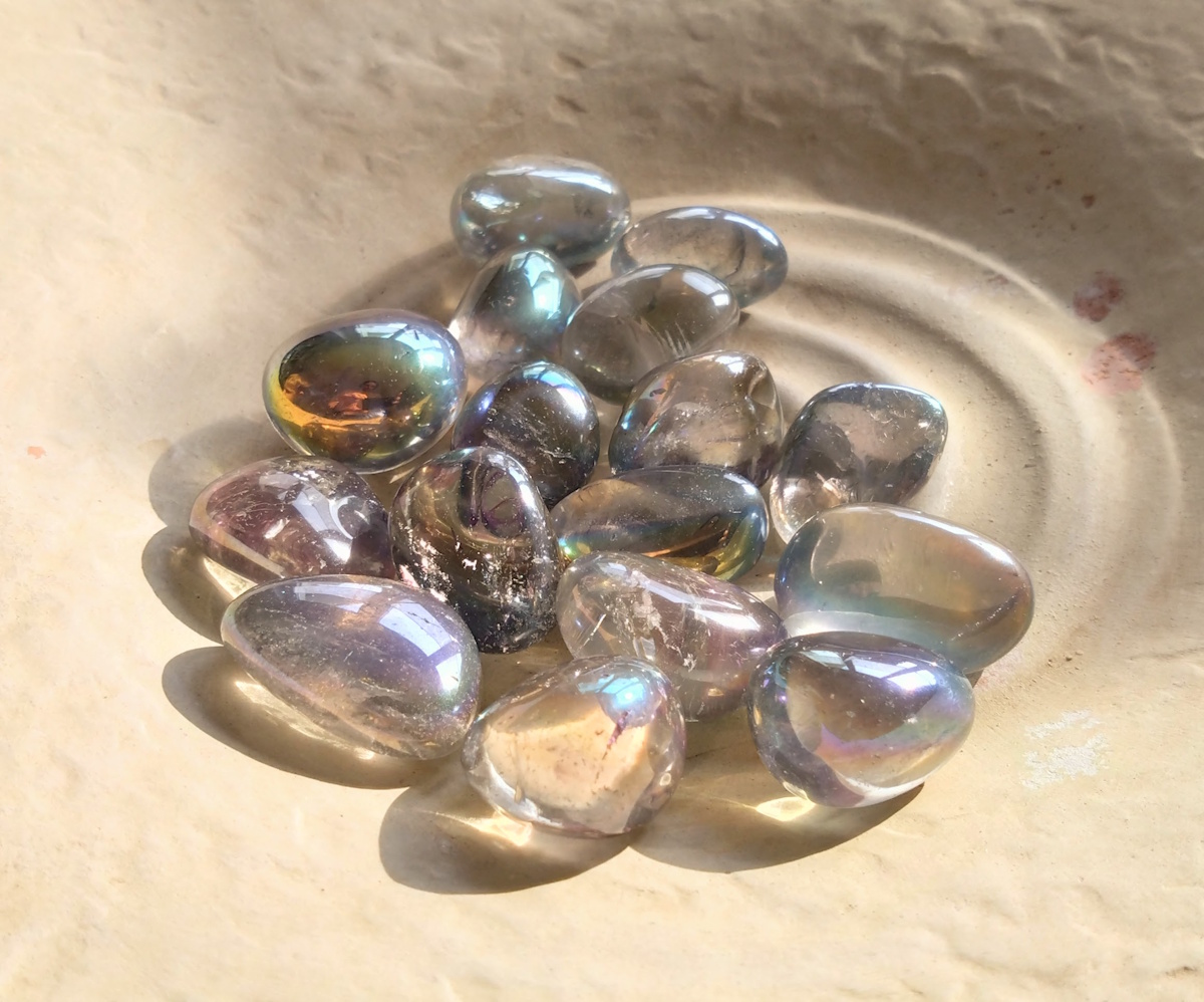 Der Angel Aura ist ein Natur-Bergkristall, der durch ein Vakuumverfahren mit Platin und Silber bedampft wird, was ihm den Regenbogen-Schimmer verleiht.