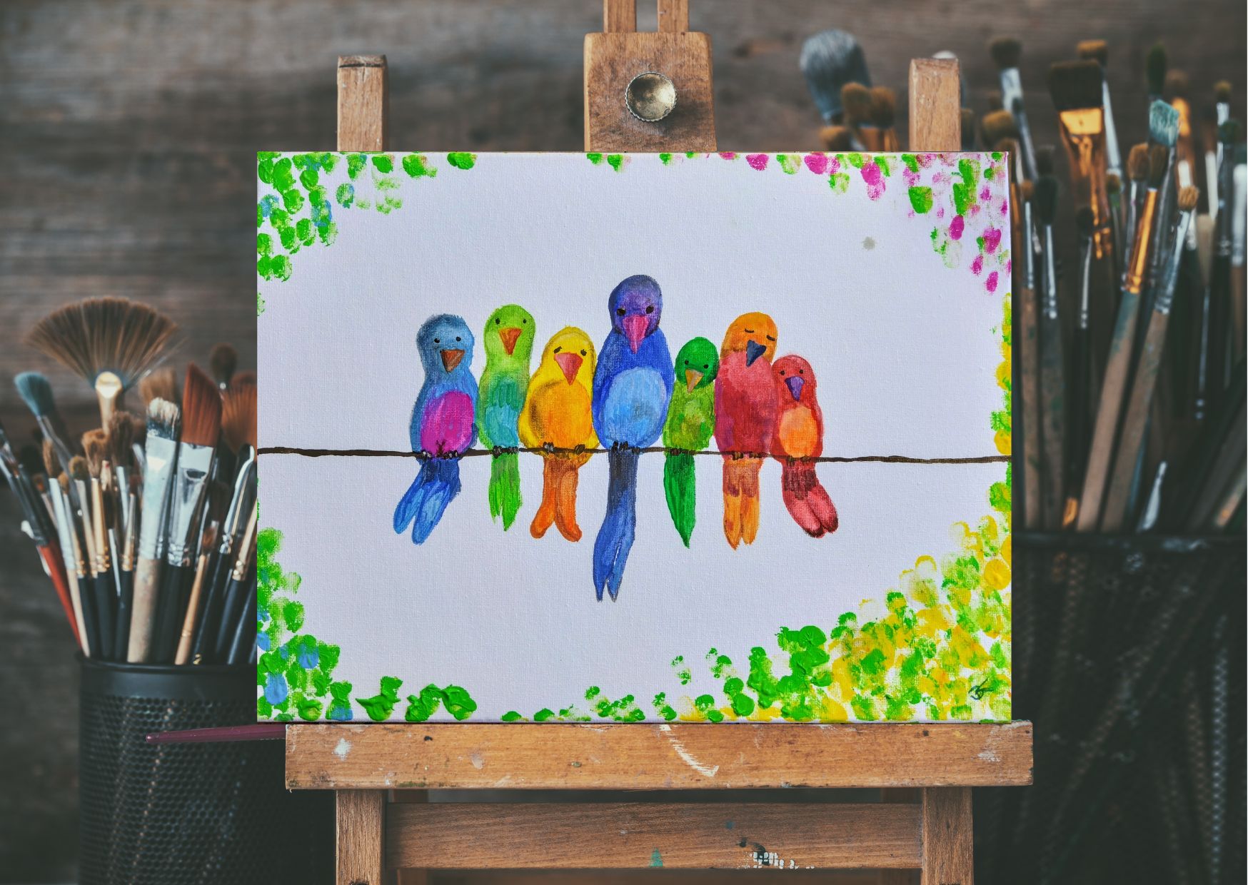Hier erleben kleine Künstler einen kreativen Vormittag. Wir malen das Bild „Die bunte Vogelclique“ – ein farbenfrohes und lustiges Kindermotiv.
