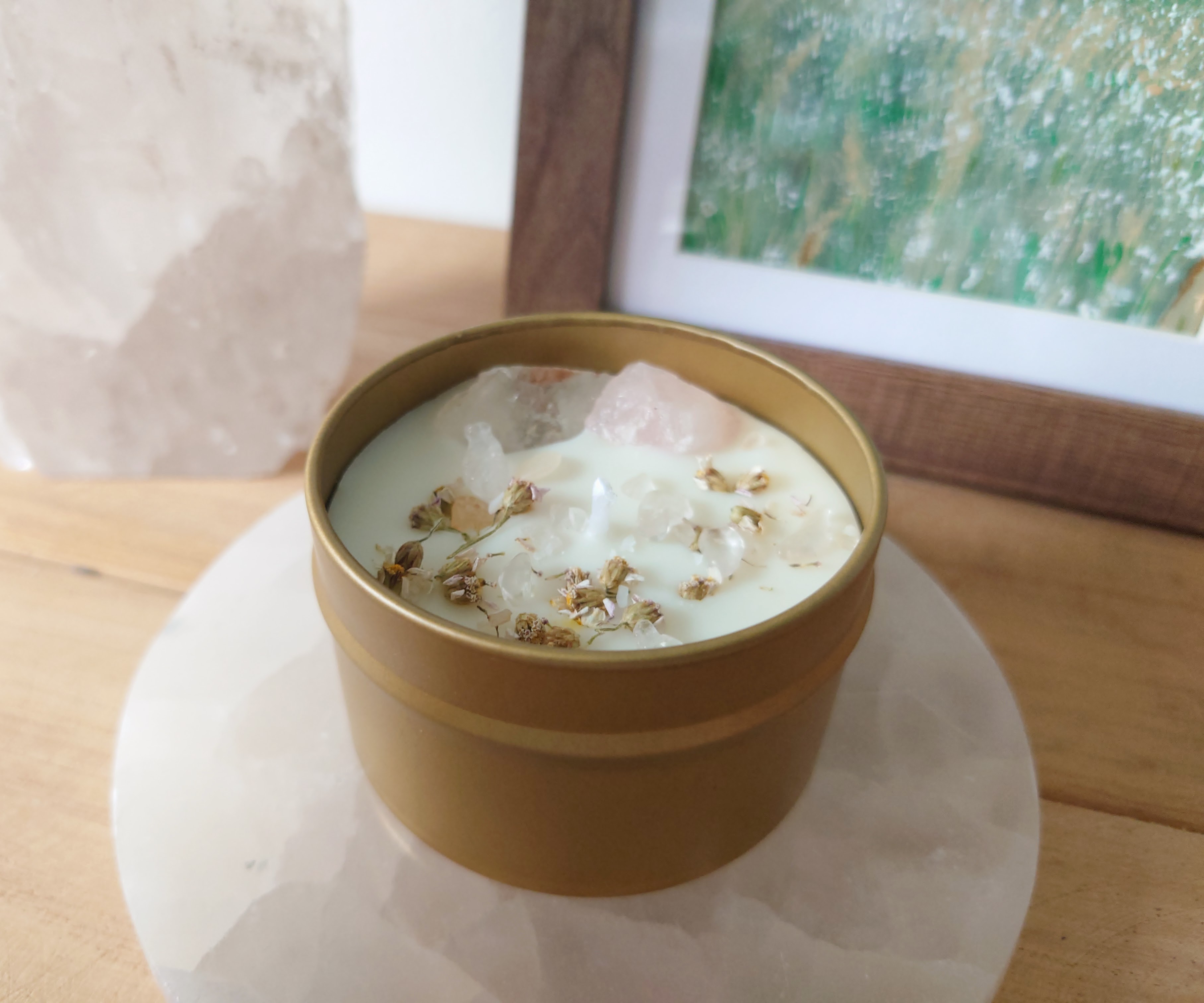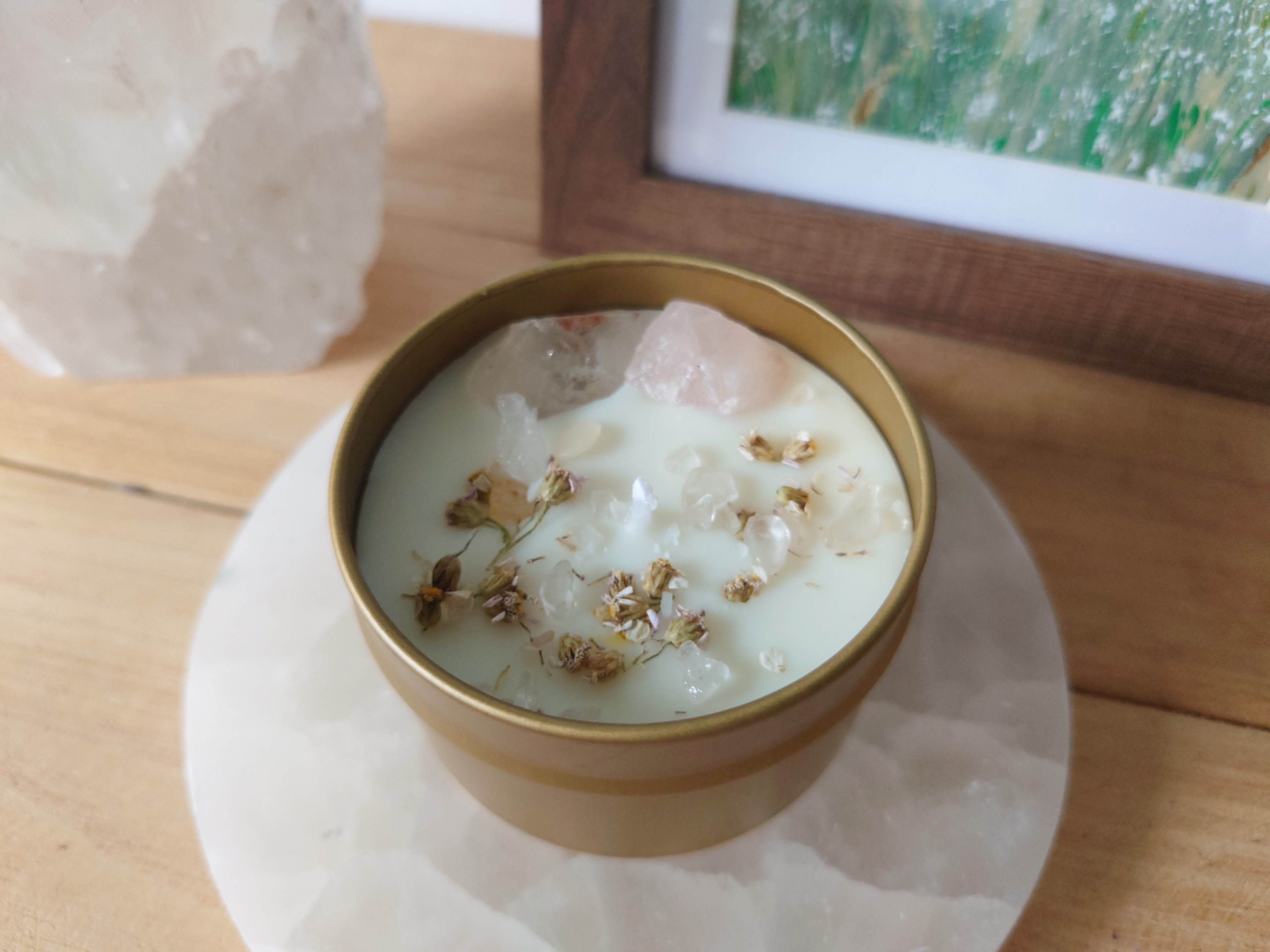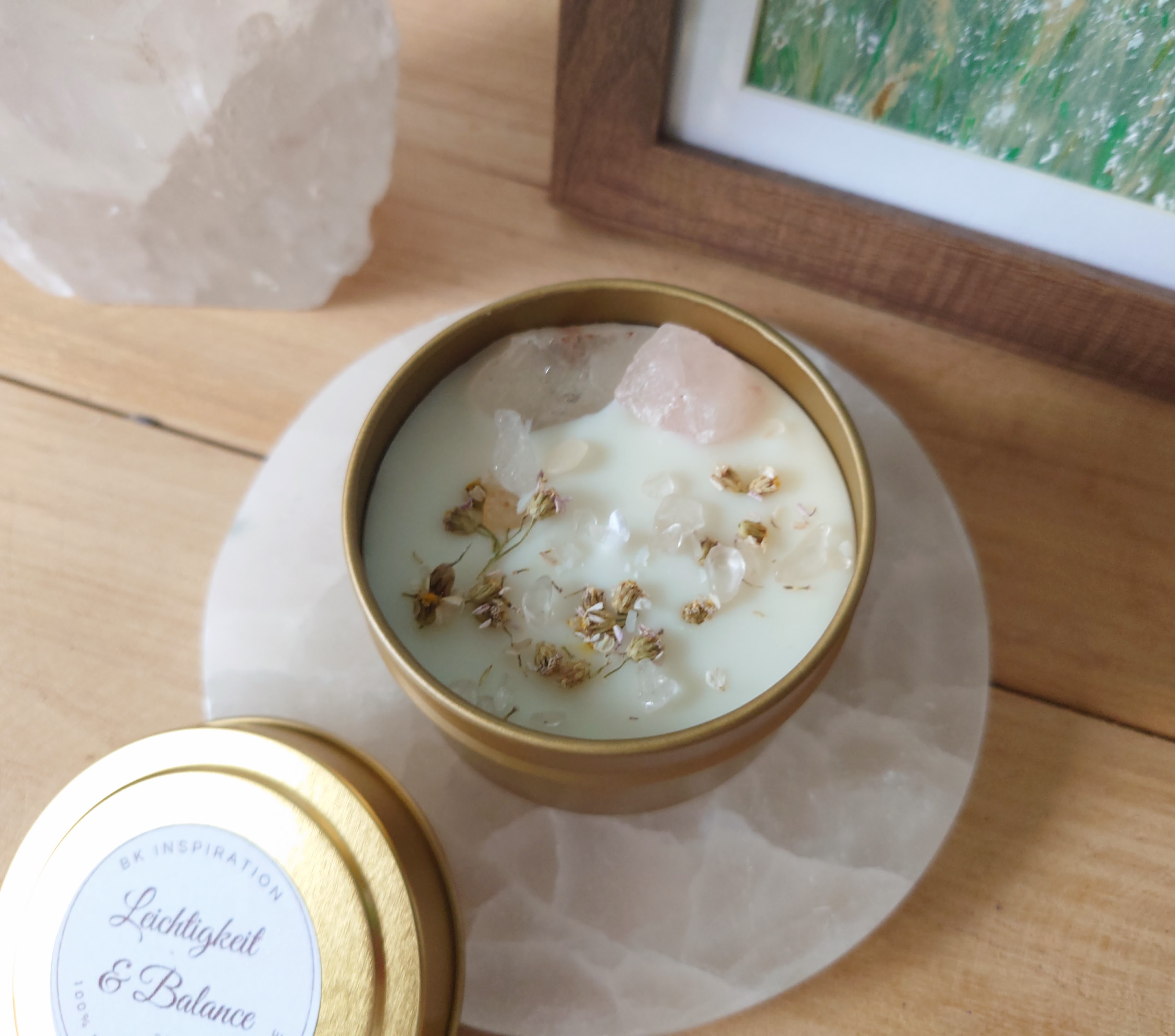 Magische Kerze mit Bergkristall und Rosenquarz Rohkristallen unterstützen das Gefühl von emotionaler Balance, Stabilität, Leichtigkeit und inneren Ankommen. Mit von Hand gesammelten und getrockneten Schafgarbe Blüten, sowie einem dezenten Duft aus reinem ätherischen Patchouli- und Rosenöl in Sojawachs gegossen.