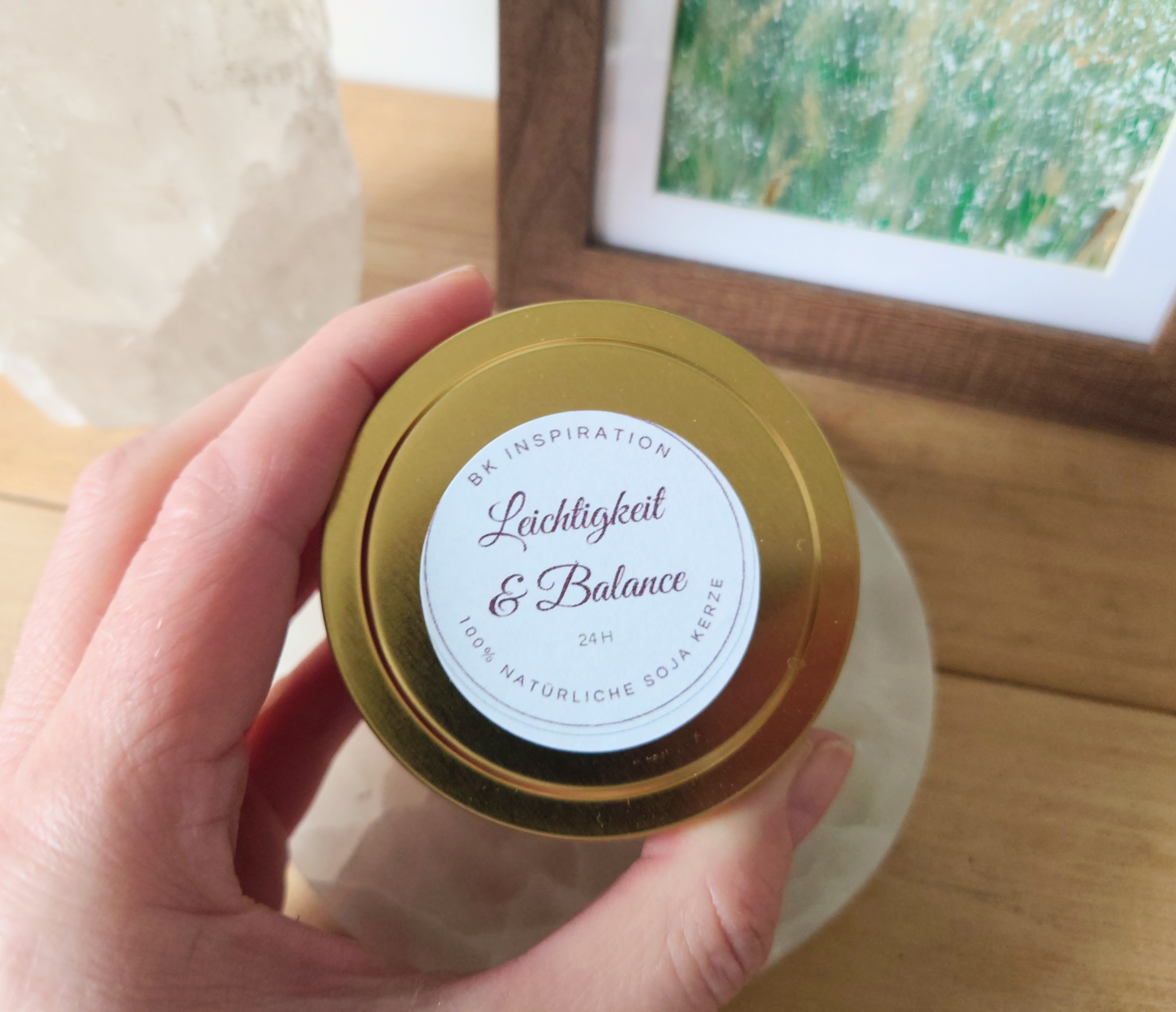 Die Kerze habe ich liebevoll von Hand für Dich gegossen. Jede Kerze ist individuell und kann im Aussehen aufgrund unterschiedlicher Größen der Kristalle von dem Bild abweichen.