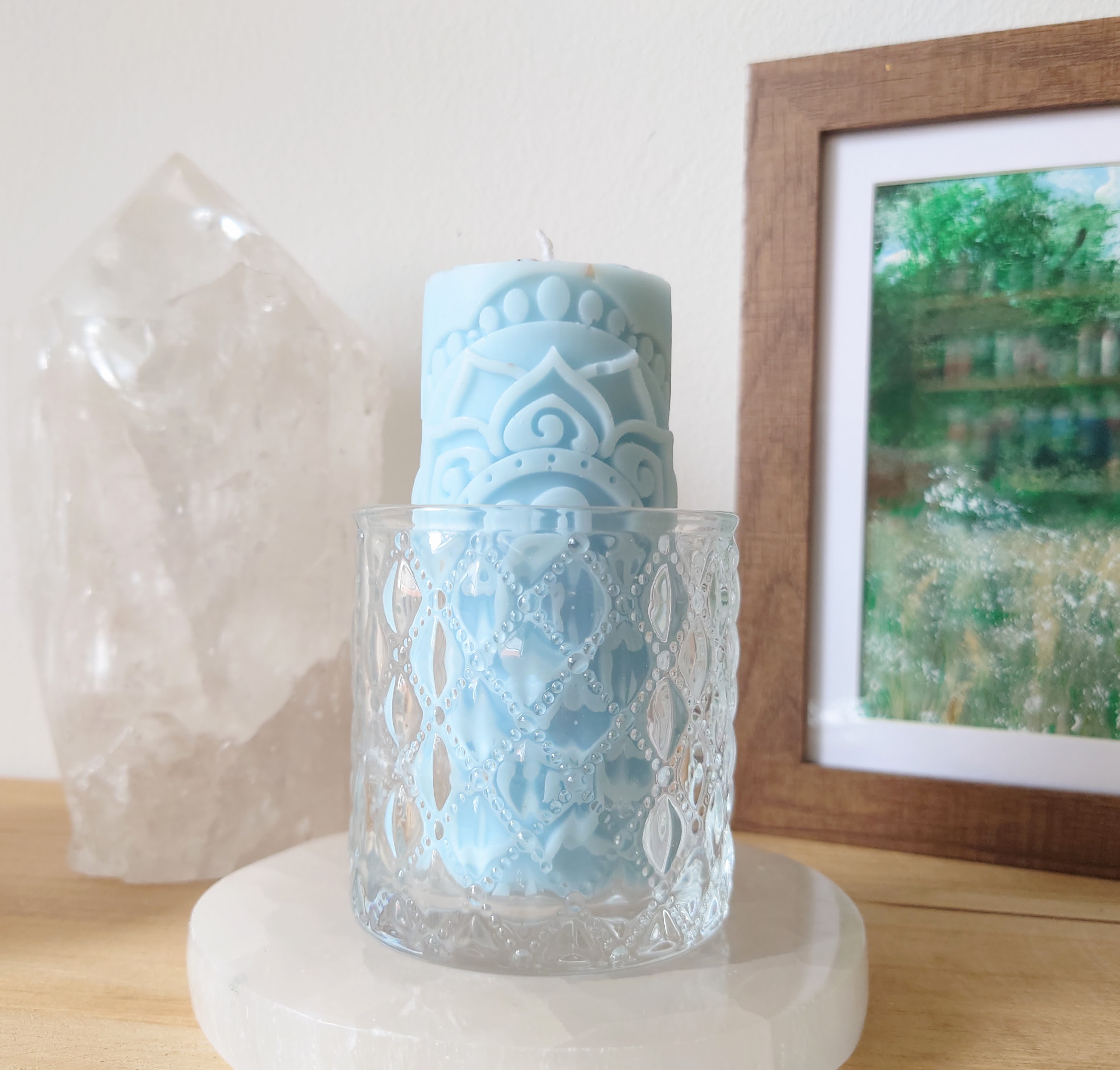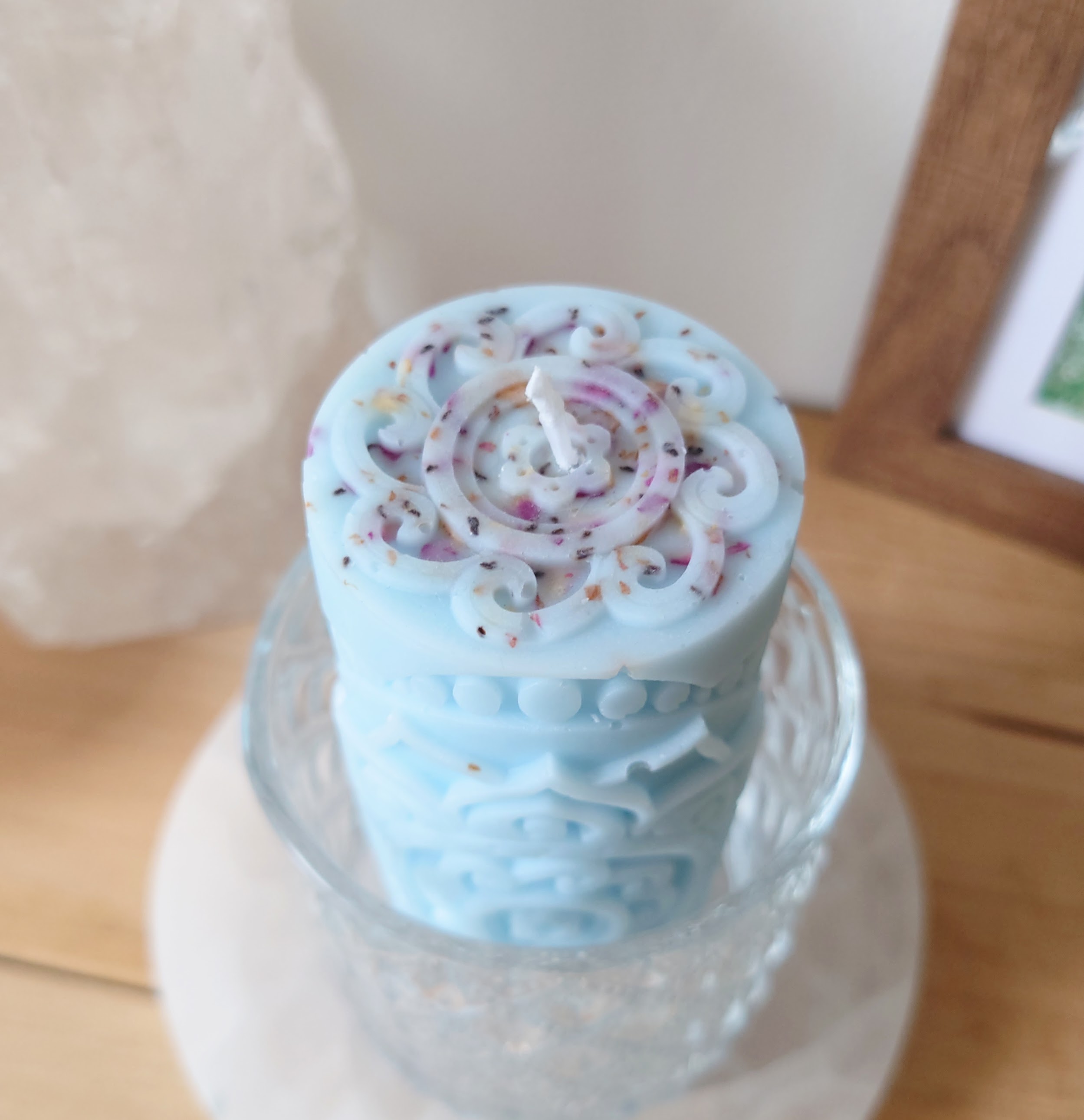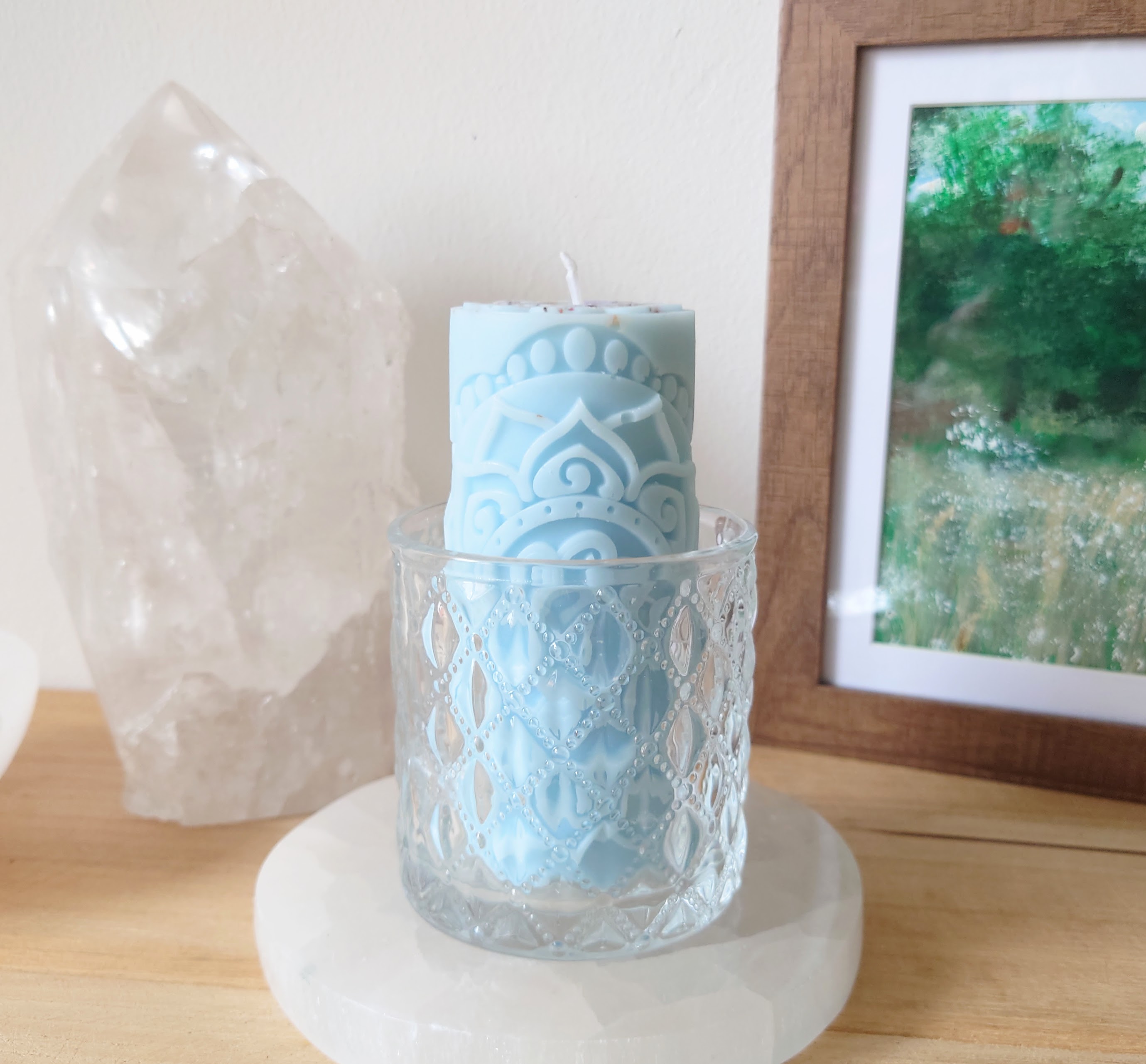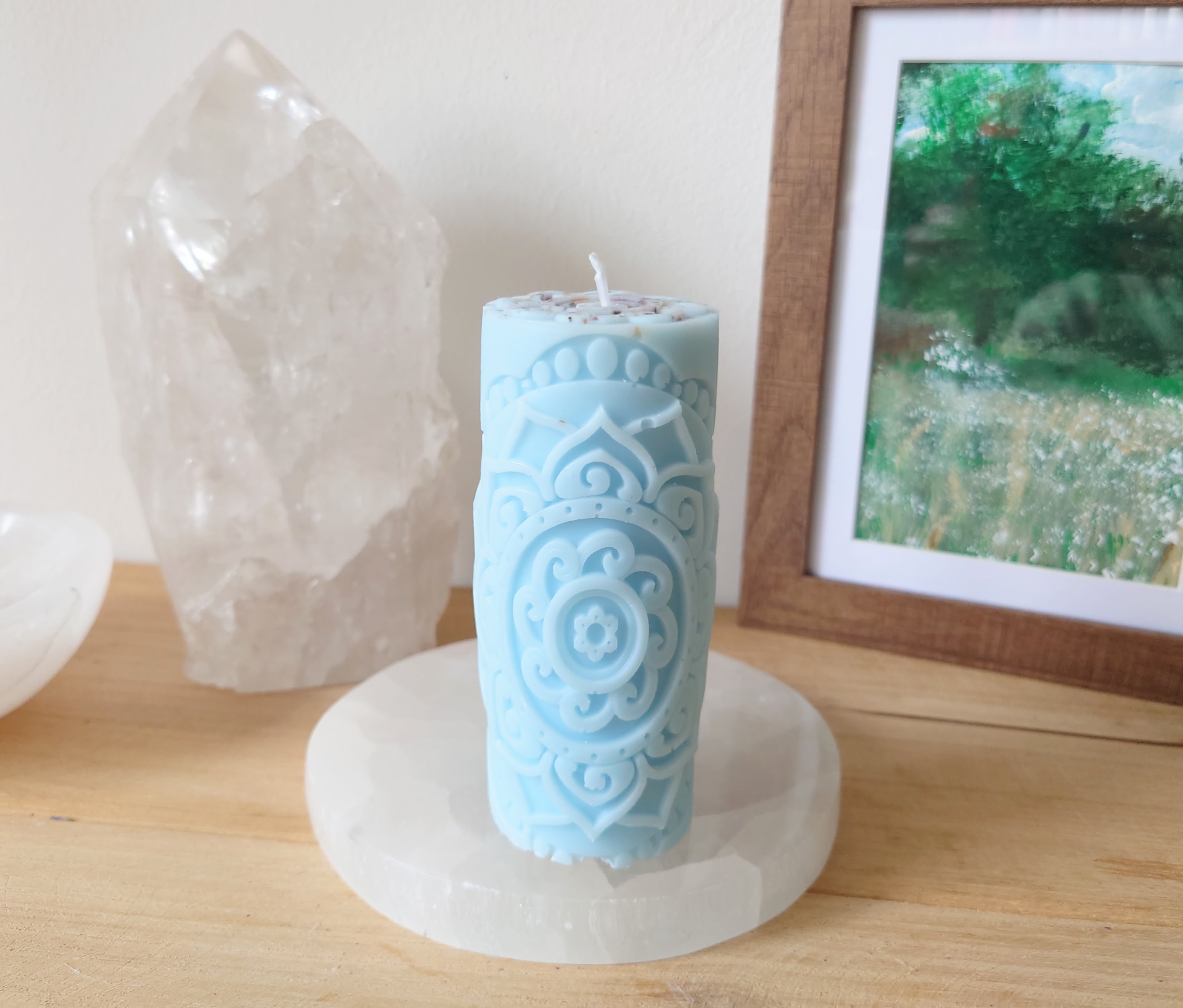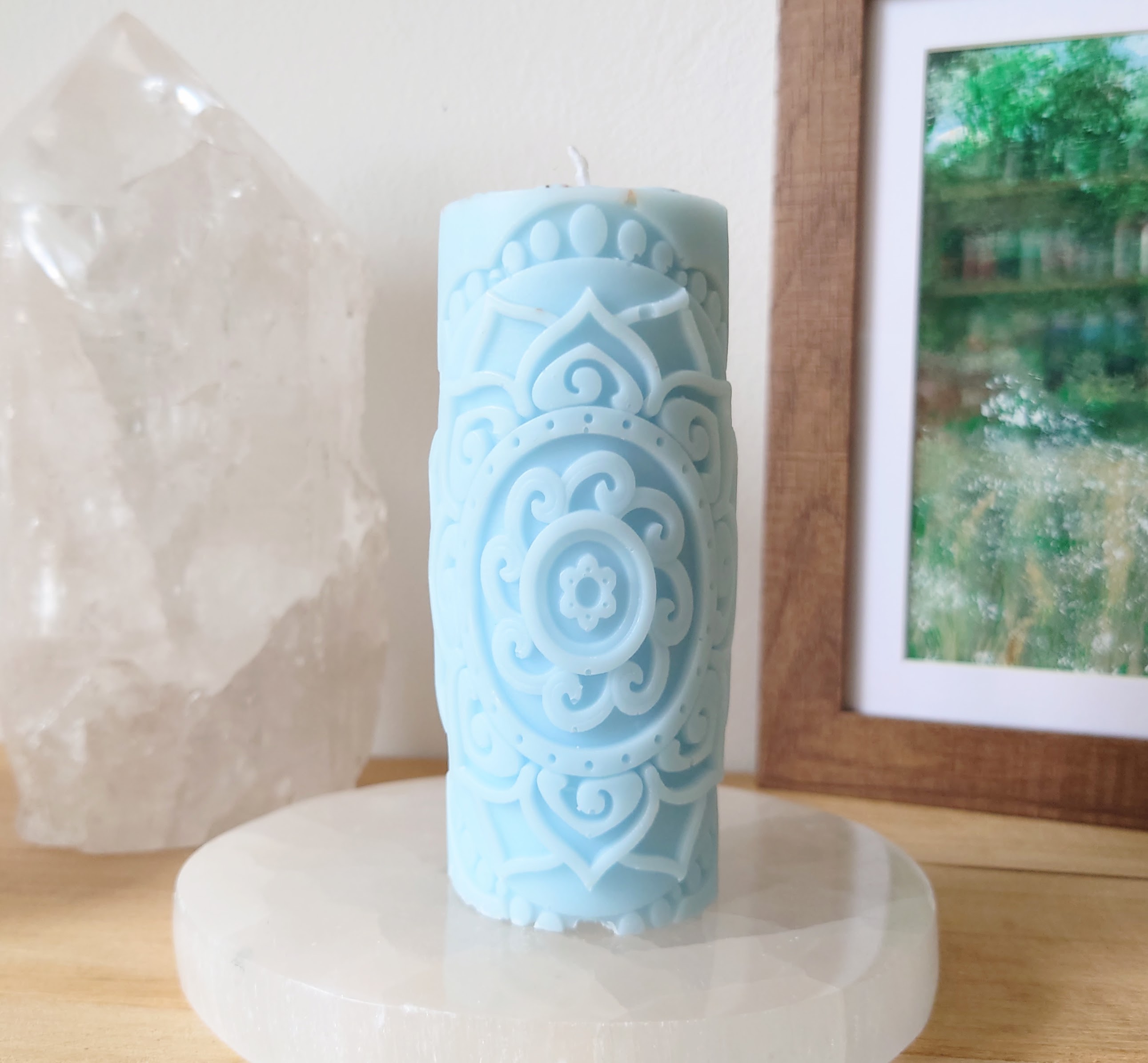 Diese zauberhafte Mandala Kerze in einem zarten hellblauen Ton bringt Entspannung und Achtsamkeit an deinen Lieblingsplatz. Die Kerze ist von Hand mit Sojawachs gegossen. Getrocknete Rosenblüten und ein dezenter Duft von ätherischen Blütenölen bringen eine wunderbar lichtvolle Energie in deinen Raum.
